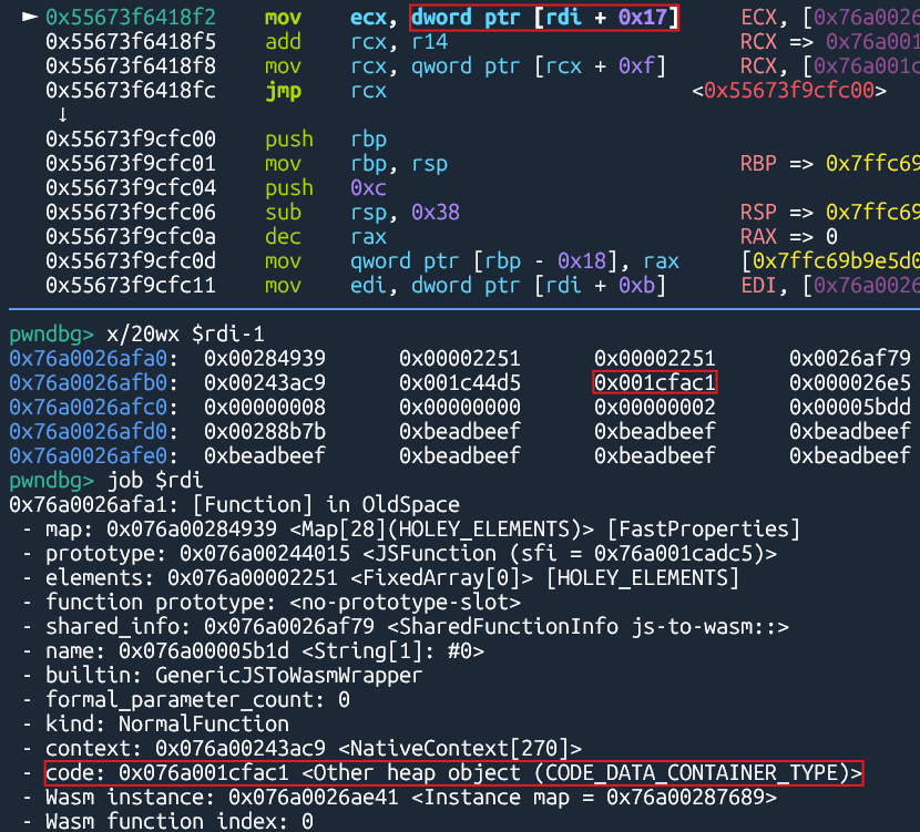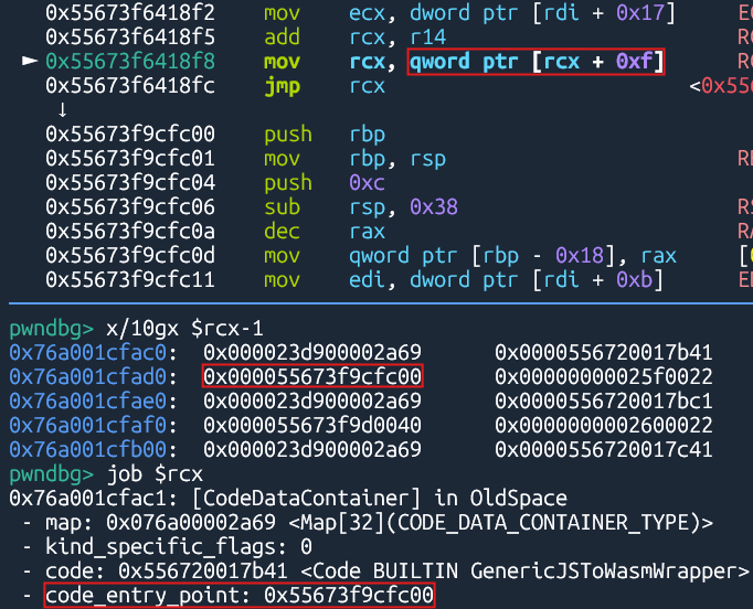 Next, the handler retrieves the entrypoint from the CodeDataContainer object and jumps to that address. This is not the WebAssembly function’s entrypoint, but rather the generic JS-to-Wasm wrapper.